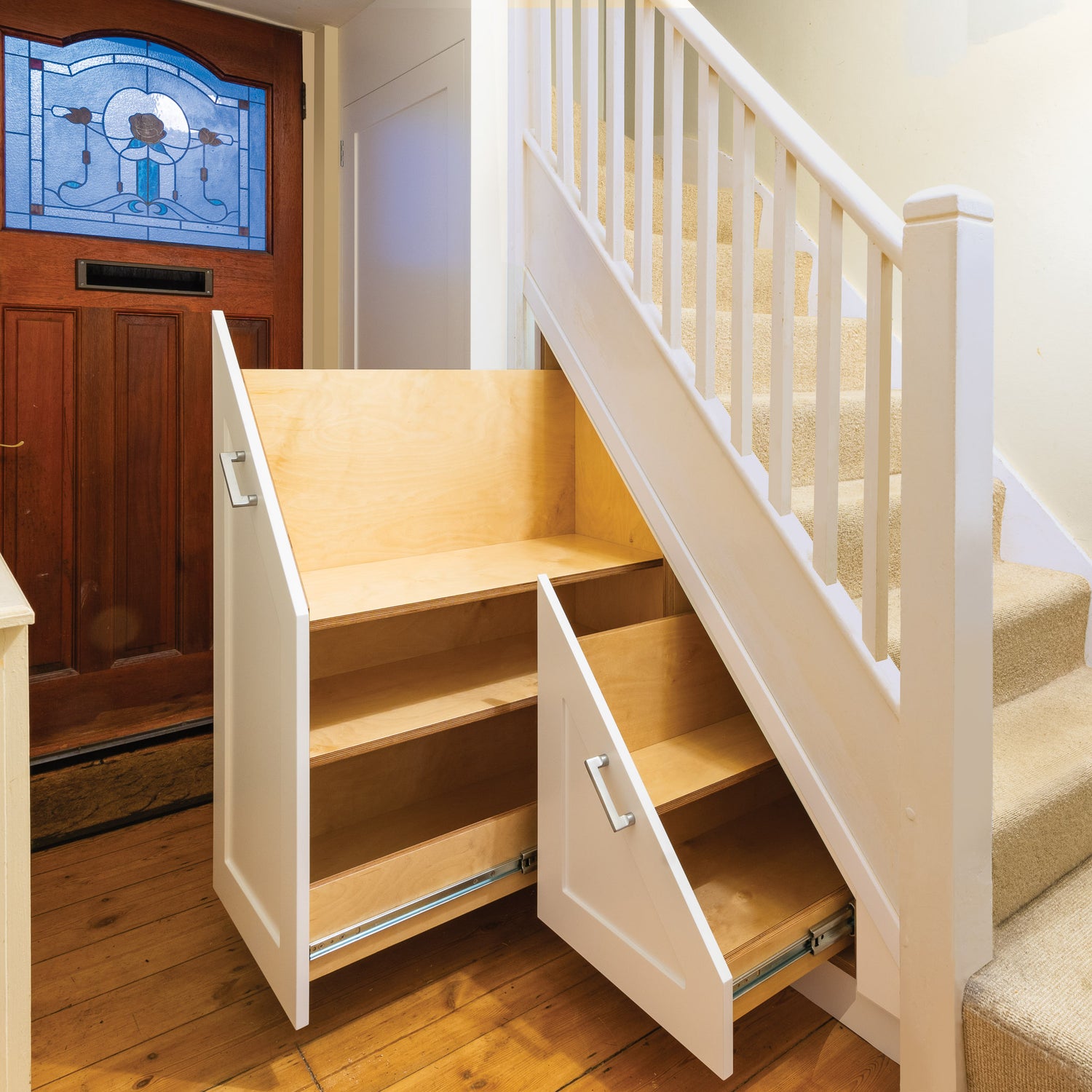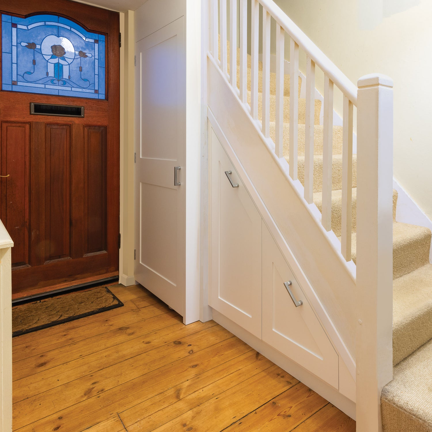 Understairs stotage incorperating deep drawers with integrates shelves and a large storage cupboard all with shaker style fronts.
