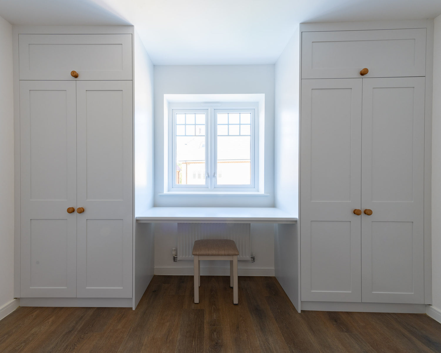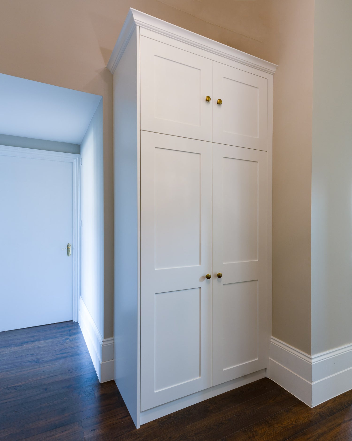 We built this pair of wardrobes to maximise hanging space while including an upper cupboard all with Shaker style doors. Fitting a top between the wardrobes