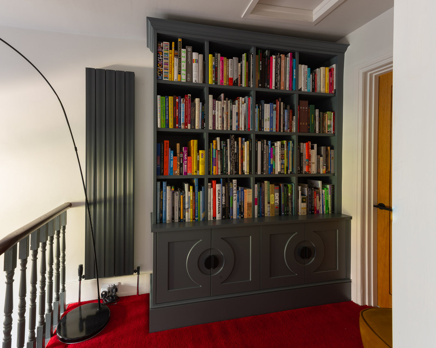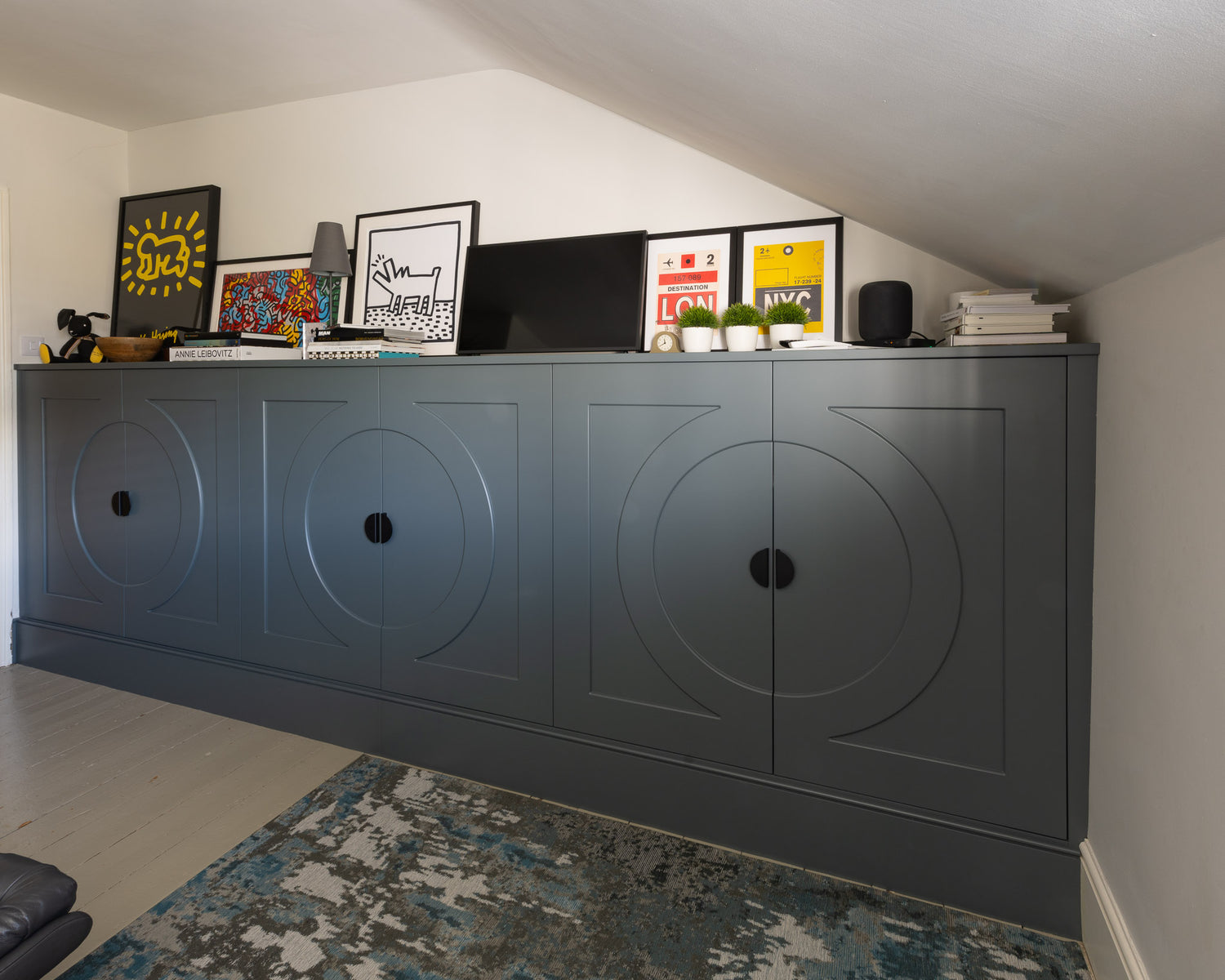 Storage unit built to match other bespoke storage in the house and designed to look like wall panelling when closed.