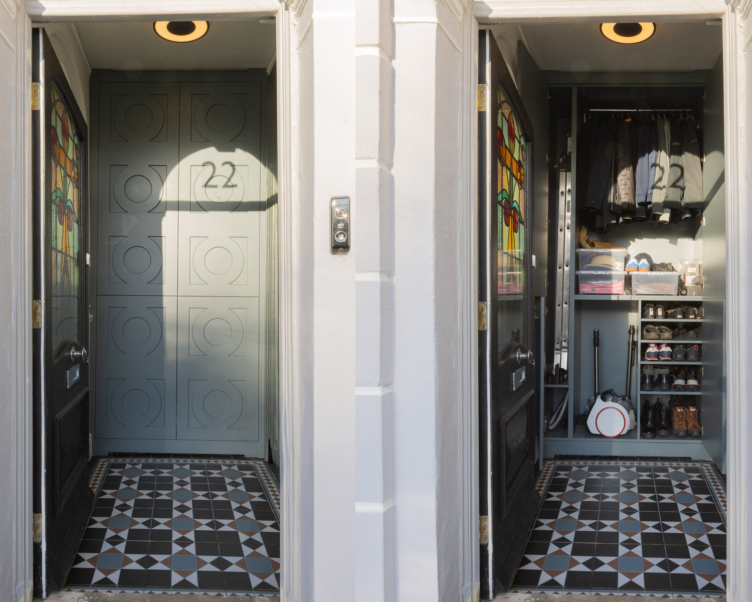 A customer who had a flat in a large Victorian house wanted to maximise storage in th hallway so we designed and built this cupboard to store coats shoes etc.
