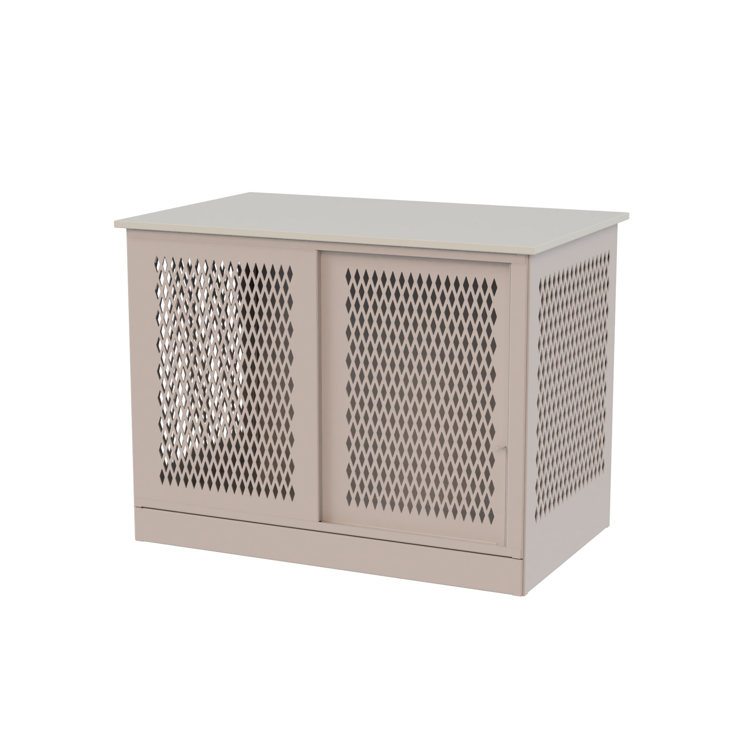 The Richmond Crate is available in small (640 L x 490 W x 530H), medium (890 L x 590 W x 530 H) and custom sizes and features a right hand sliding door, easily removeable plinth and slide out cleanable tray and child resistant latch.